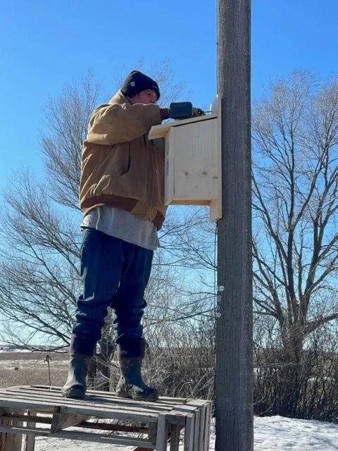 Grasshoppers- the kestrel’s favorite food- are extremely damaging to crops and property on the Northern Great Plains. Every few years, thousands of grasshoppers descend on the plains of South Dakota, causing destruction and frustration to communities. Though many landowners and farmers choose “conventional” methods of population control (Insecticidal sprays, baits, etc) many of the community members we work with prefer to avoid the use of synthetic pesticides, especially in areas where Traditional Medicines are grown.