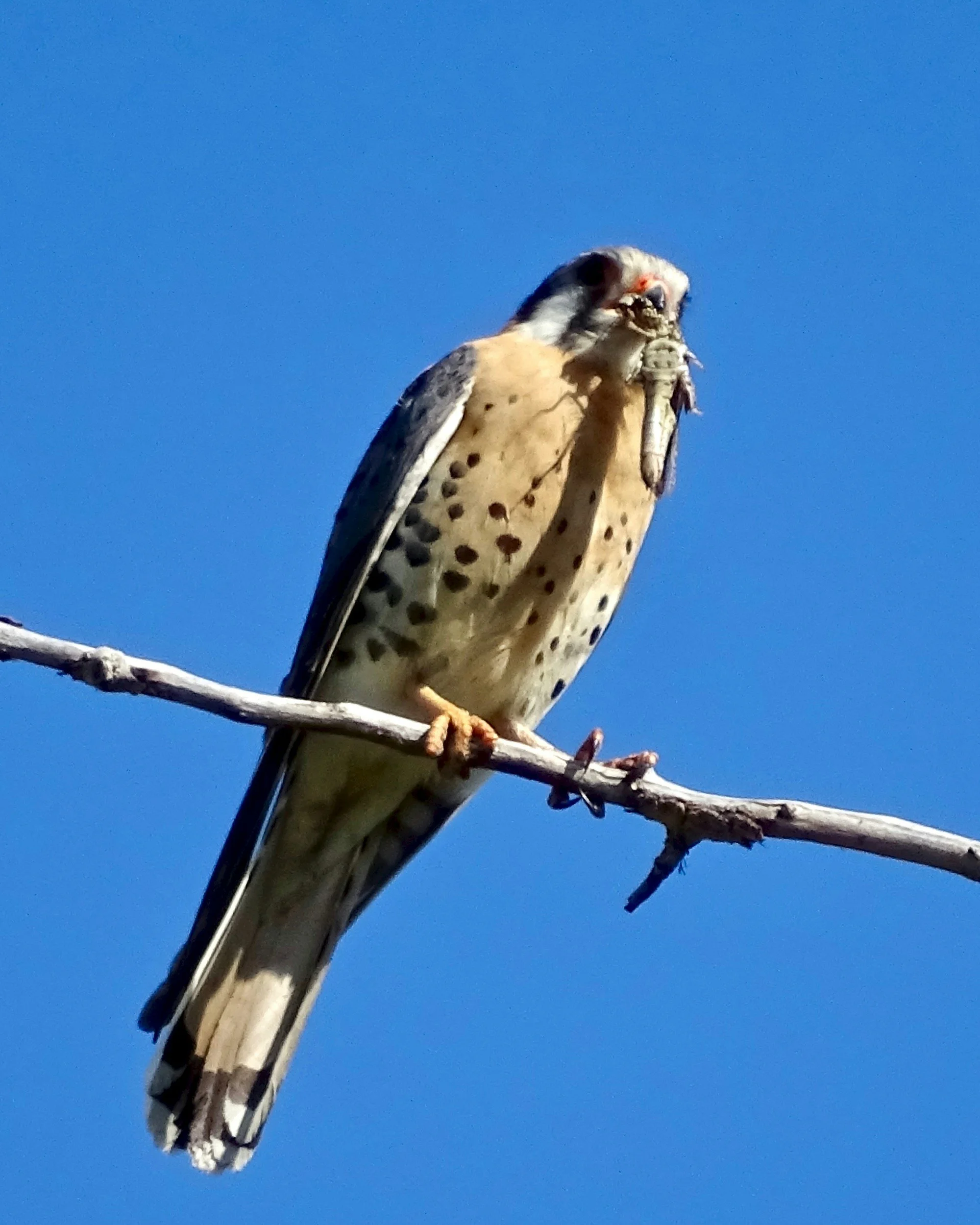 American Kestrels, North America’s smallest falcons, are small but mighty predators. Though they are little- no larger than a dove or pigeon- they are “mean green grasshopper eating machines”. Every part of their anatomy, from their tomial toothed beaks used for severing the spinal cords of prey to the black malar stripes present to limit sun glare, is designed to kill small mammals and insects.